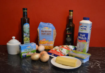 Mehl, Creme fraiche, Thymian, Knoblauch, Olivenöl, Bergkäse, Zucchini, Schnittlauch