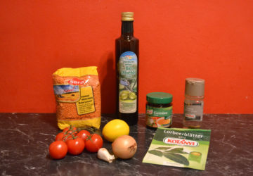 In einem Topf einen großzügigen Schluck Olivenöl erhitzen, ein oder zwei Lorbeerblätter hinzufügen und die Zwiebeln glasig anschwitzen. Dann den Kürbis dazu geben und mitrösten. Etwas Ingwer darüber stäuben und mit heißem Wasser aufgießen. Nicht zu viel Wasser verwenden, sonst wird die Suppe zu dünn; der Kürbis sollte gerade bedeckt sein (mehr Wasser kann man immer noch dazu geben). Einen gehäuften Teelöffel Suppenpulver unterrühren und so lange kochen lassen, bis der Kürbis weich ist.