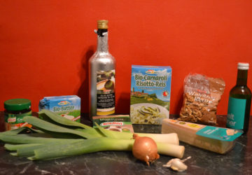 Die Zwiebel und den Knoblauch fein hacken. In einem hohen Topf Butter und Olivenöl erhitzen. Zuerst die Zwiebeln glasig anschwitzen, dann den Knoblauch dazugeben und etwa eine Minute später den Reis. Ein bisschen anrösten, damit alle Reiskörner mit Fett überzogen sind. Dann mit einem großzügigen Schluck Weißwein ablöschen. Etwa einen halben Liter kräftiger Gemüsesuppe bereitstellen.